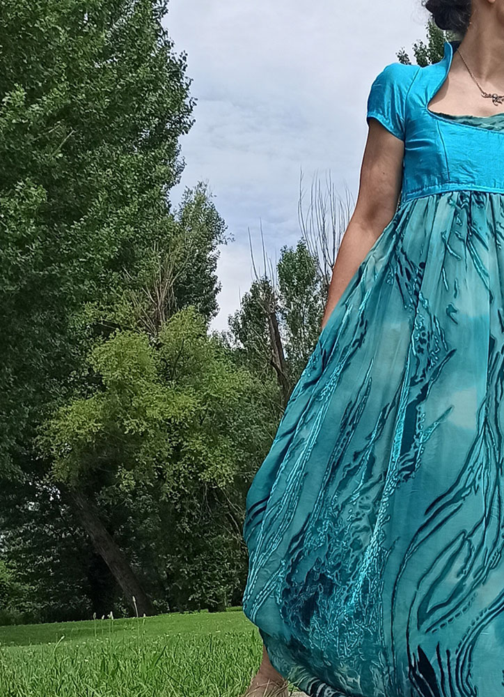 I wanted to make the most of the fabric and respond to that sense of fluidity. So I constructed a fitted top part in Garment Designer, with an Empire/regency impromptu (my favorite Time period). With curvy soft lines. And then I up-cycled a Turquoise Thai silk (a skirt+ shirt for 2 dollars from a thrift store, some 25 years ago) for this purpose.