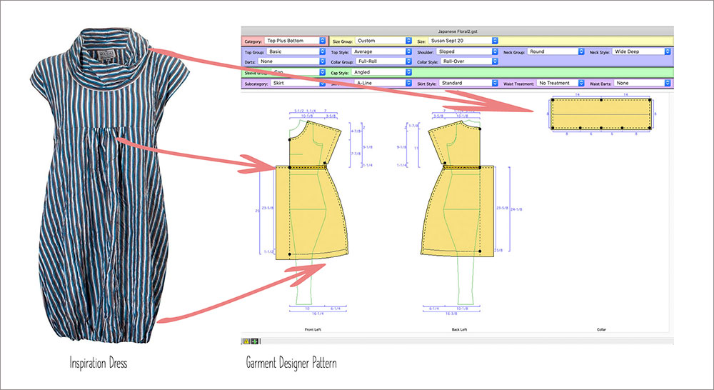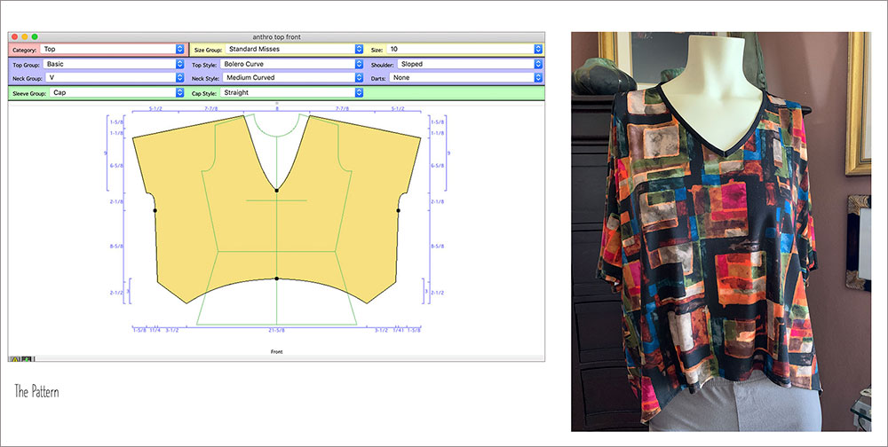 I had purchased a great fabric on a trip to Japan thinking it would make a great dress and so when I saw the image of the garment on the left above, I knew it was the right style. Starting with the base pattern, I only used the top of my Cap Sleeve basic garment, (setting them length very short so it ended above the waist). I widened the neckline and lowered it at center (both front and back) and then chose the Roll-Over collar which I widened.