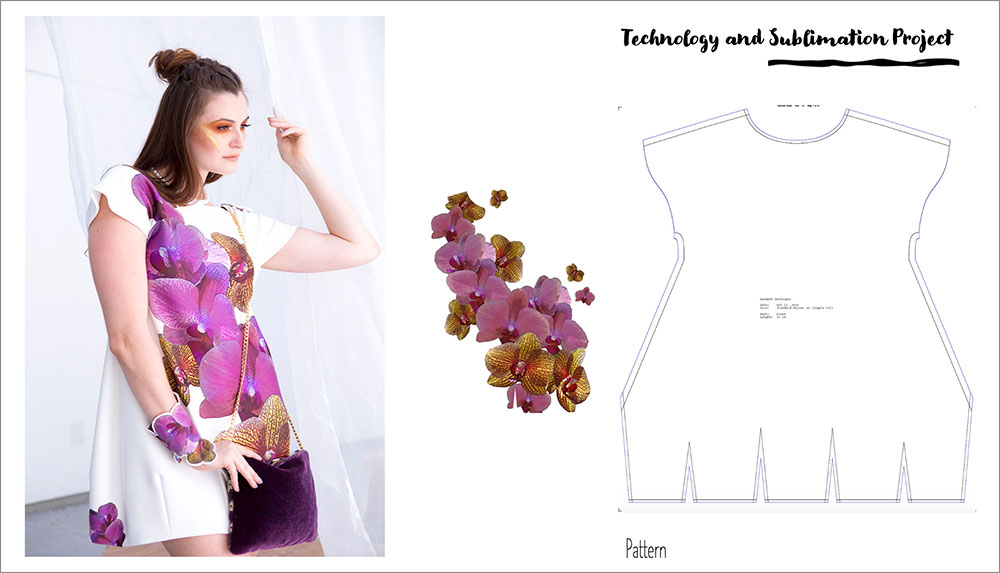 - I then took a photo of orchids and reworked it in Photoshop with filters. Then, I laid it into a full-scale PDF of the garment patterns. Off it went to Spoonflower for printing.