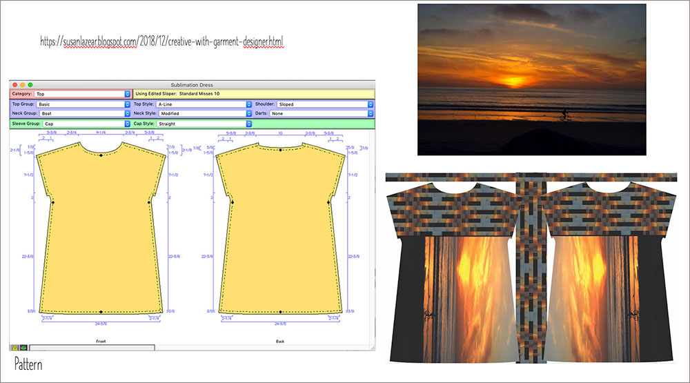 Since I was sending the garment/imagery to be printed via sublimation, I save the full-scale pattern as a PDF file which I took into Photoshop to lay the imagery into place. I discuss the general process of how to do this on a past blog entry on Blogspot. I changed the pattern somewhat from the blog.